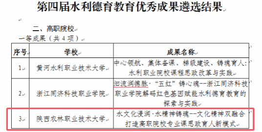 近日,中国水利教育协会公布了第四届水利德育教育优秀成果的遴选结果,一共收到47所来自本科、高职、中职院校报送的75项成果。经汇总初审、线上评审、现场评审、专家评议及公示等程序,共遴选出第四届水利德育教育优秀成果44项。其中高职院校一等成果4项,二等成果8项,三等成果12项。我院张鸥老师主持完成的成果《水文化浸润 水精神铸魂--文化精神双融合打造高职院校专业课思政育人新模式》荣获一等奖。