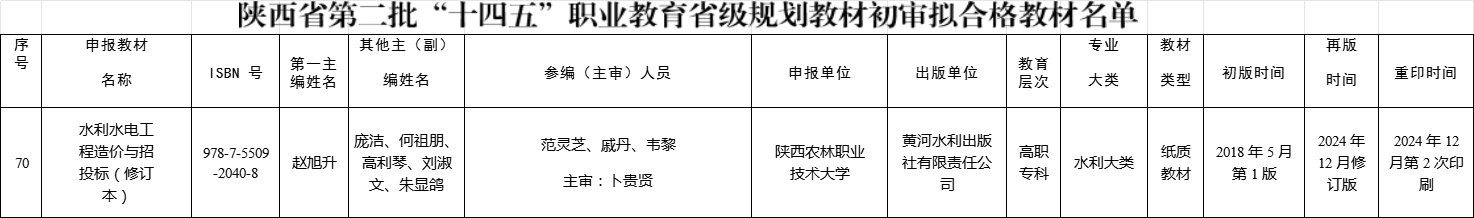 根据陕西省教育厅《关于陕西省第二批“十四五”职业教育省级规划教材初审拟合格教材名单的公示》公告,经省教育厅初审,水利工程学院《水利水电工程造价与招投标(修订本)》入选陕西省第二批“十四五”职业教育省级规划教材初审拟合格名单。